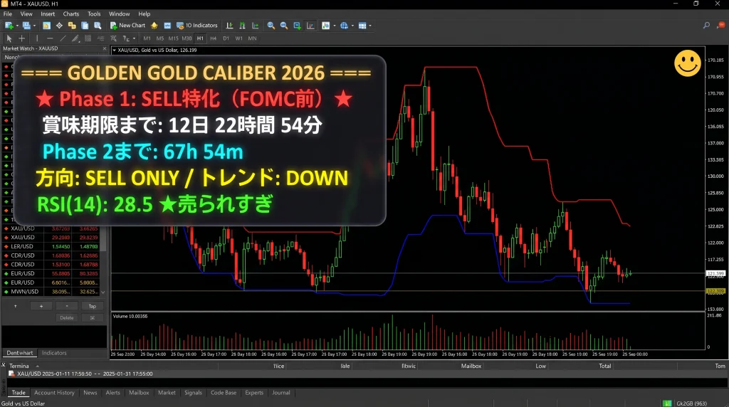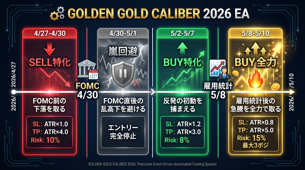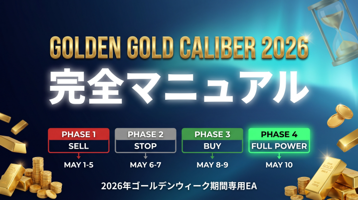 さらに、2026年のGW期間中にはFOMC(4/30)米雇用統計(5/8)という2大イベントが控えています。GOLDEN GOLD CALIBER 2026は、これらの過去データと今年のイベントスケジュールを組み合わせた「イベントドリブン型フェーズ移行ロジック」を搭載しています。