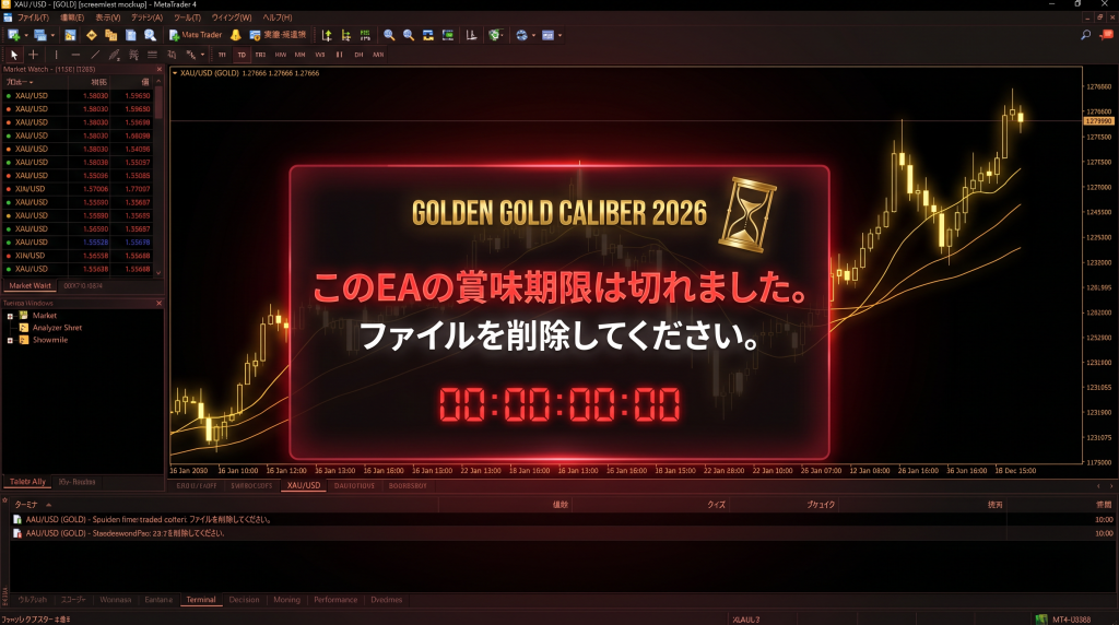 稼働期間が終了すると、EAは自動で全ポジションを決済し、「賞味期限切れ」のメッセージを表示して停止します。その後はファイルを削除してください。