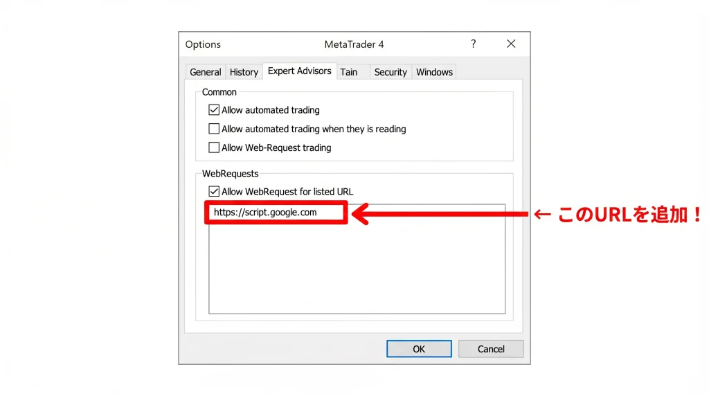 ▲ MT4のオプション画面。「WebRequestを許可するURLリスト」にURLを追加します。