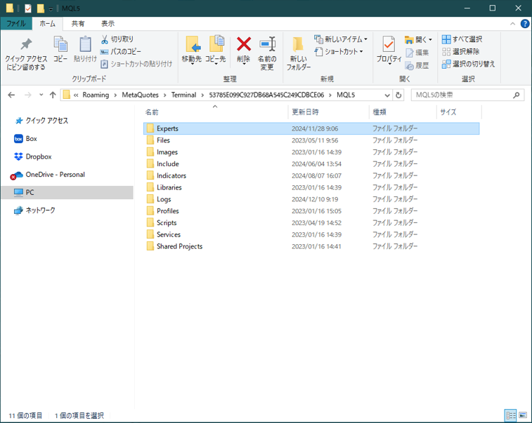 次にMT5の画面の左上の「ファイル」→「データフォルダを開く」→「MQL5」→「Experts」をクリックします。