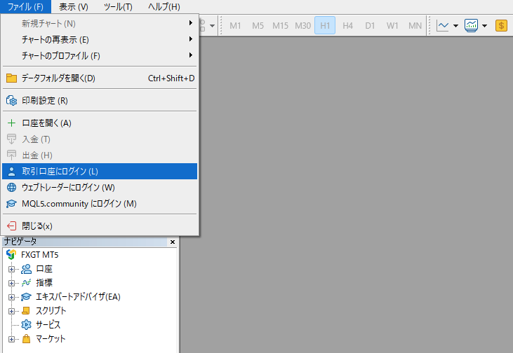 MT5を開いたら画面左上にあるファイルより「取引口座にログイン」をクリックしてください。