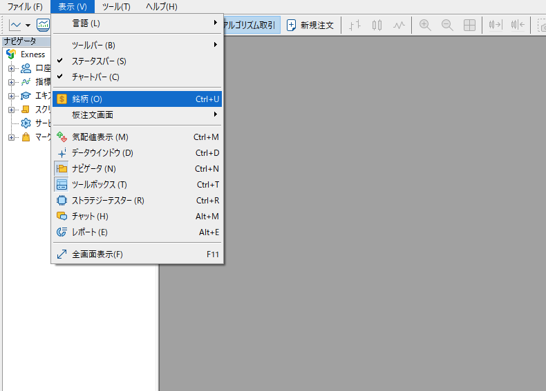 メニューバーの「ファイル」から「新規チャート」を選択すると、表示できる通貨ペアの一覧が出てきますので、「XAUUSD(GOLD)」を選んでチャートを表示させてください。