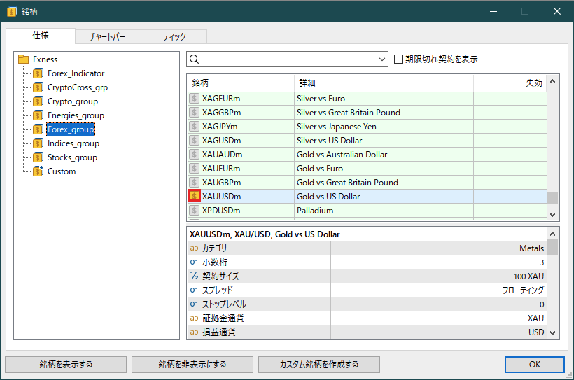「Forex_group」の中から「XAUUSD(GOLD)」を探して$マークをダブルクリックすると一覧に表示されます。