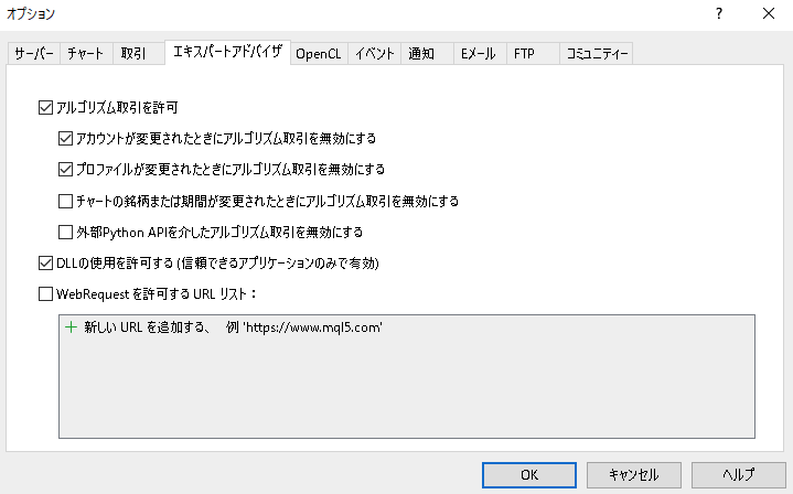 以下の画面で「アルゴリズム取引を許可」、「DLLの使用を許可する」にそれぞれチェックを入れOKをクリックします。
