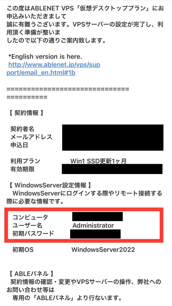 お申し込みが完了するとメールにVPSの接続情報が届きます。