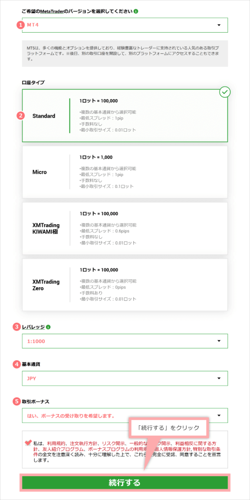 ⚠️①は必ず「MT4」を選択するようにしてください。